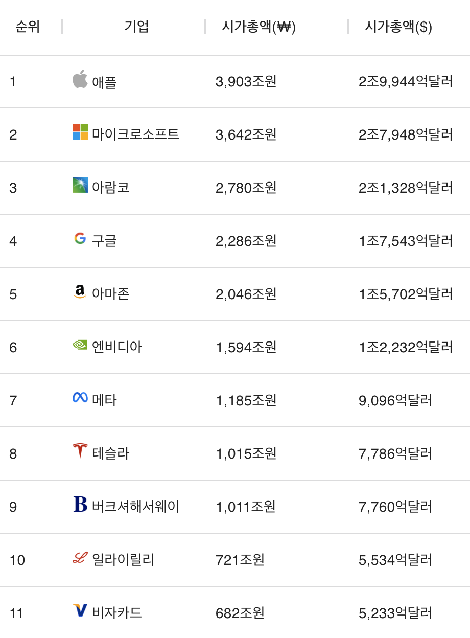 세계 시총 순위가 제조업 기업에서