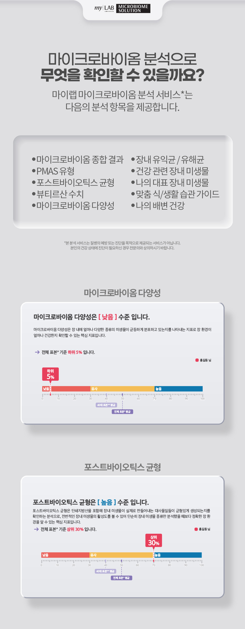 - 과학적인 분석: 유익균과 유해균의 비율, 미생물 다양성 등 나의 장내 환경을 정밀하게 분석해줍니다.