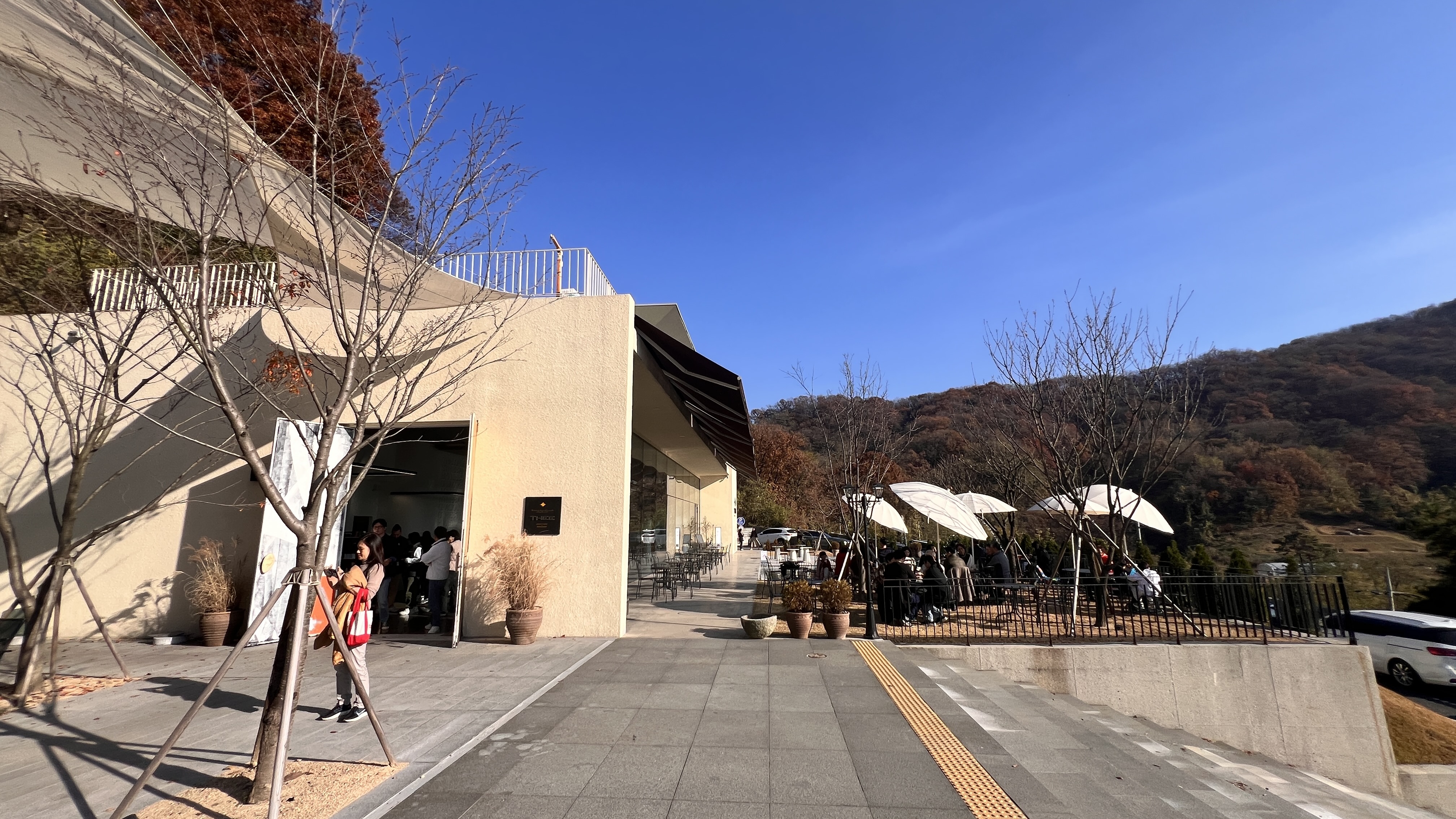 대형 카페답게 단독 건물로 운영되며, 메인 카페 건물 외에 별도의 전시 공간이 함께 있어 일반 카페와 차별화됩니다.