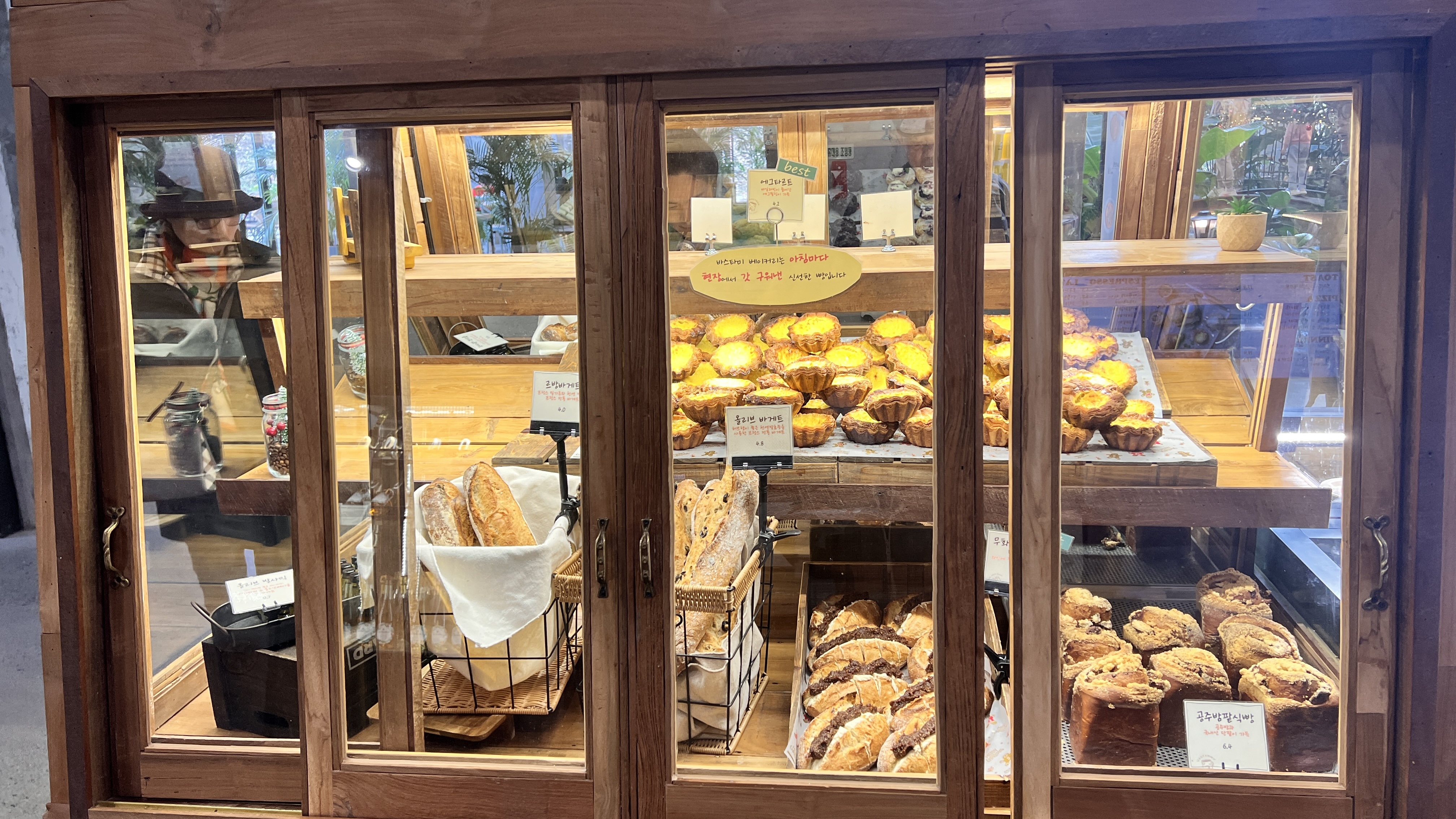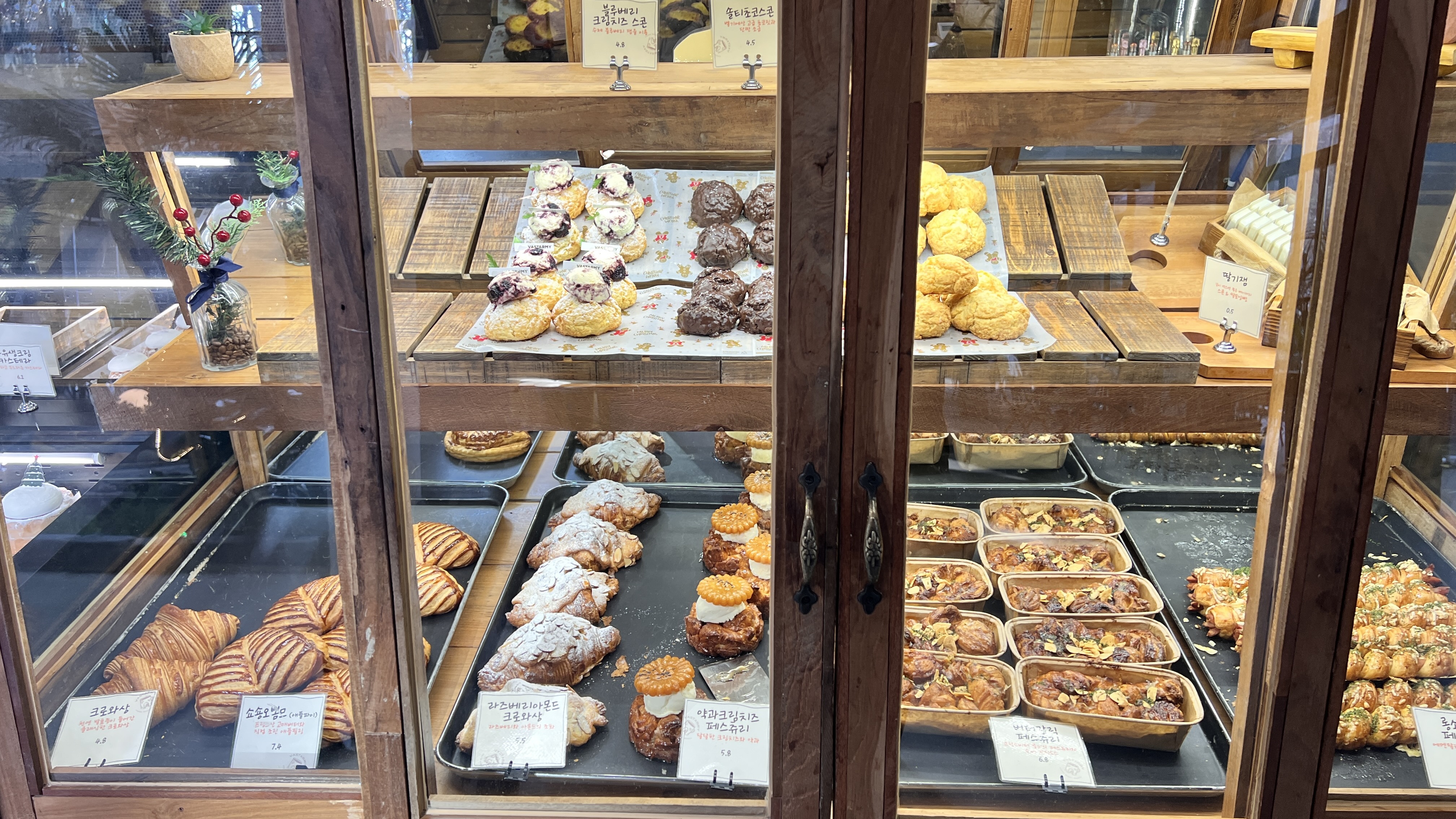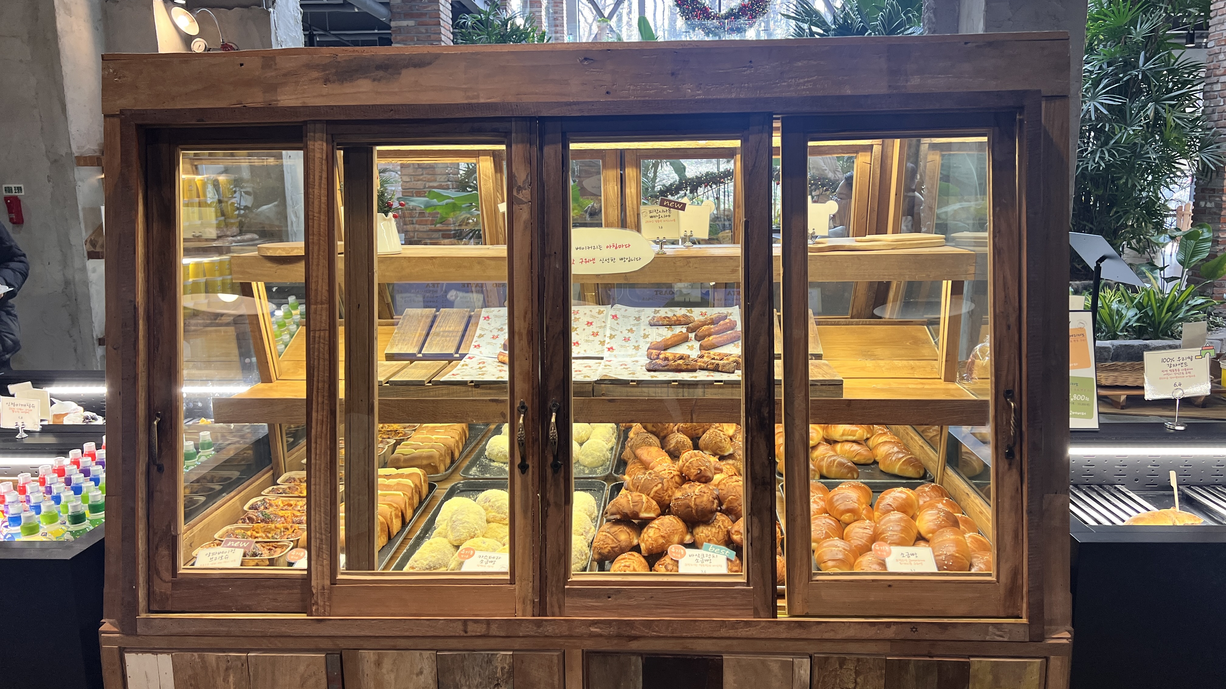 쇼케이스 위에는 황금빛으로 구워진 소금빵, 겹겹이 쌓인 페이스트리, 그리고 계절 과일이 올라간 타르트와 케이크가 빈틈없이 채워져 있습니다. 마치 미식가의 보물창고에 들어온 듯, 어떤 것을 골라야 할지 행복한 고민에 빠지게 만드는 풍부한 선택의 즐거움이 있습니다. 단순히 빵을 구매하는 것을 넘어, 진열대 앞에서 눈으로 빵의 질감과 색감을 감상하고, 하나하나 스토리를 상상하며 고르는 과정 자체가 훌륭한 힐링 경험이 됩니다."