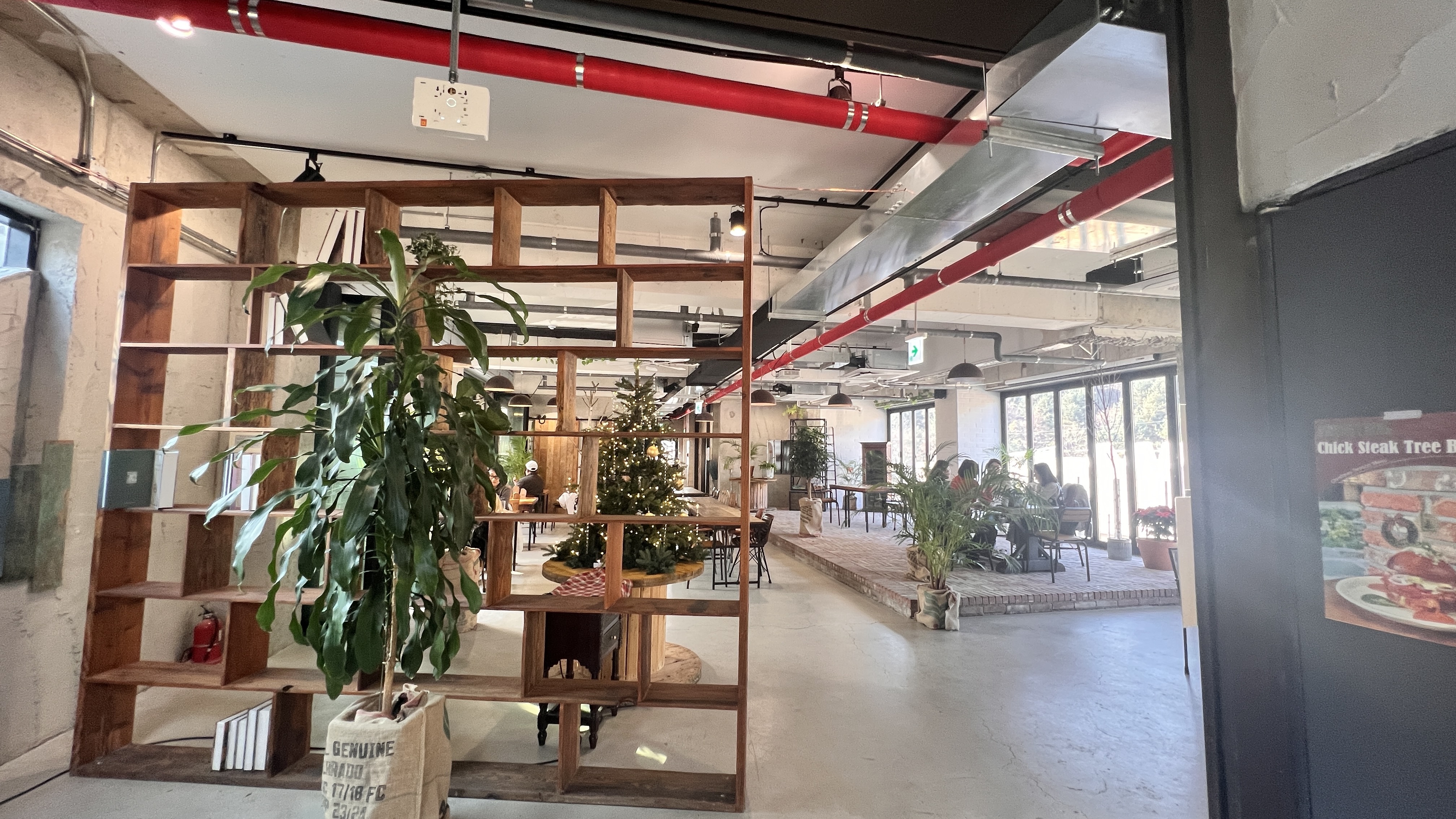 여기의 핵심은 인테리어예요. 1층이 그냥 보통의 플랜테리어가 아니라, 하나의 작은 생태계를 실내에 옮겨 놓은 듯한 느낌을 줍니다. 건물이 워낙 웅장해서 층고가 시원하게 높고 사방이 통유리창이라 주변의 푸른 자연 풍경이 실내로 그대로 쏟아져 들어옵니다.