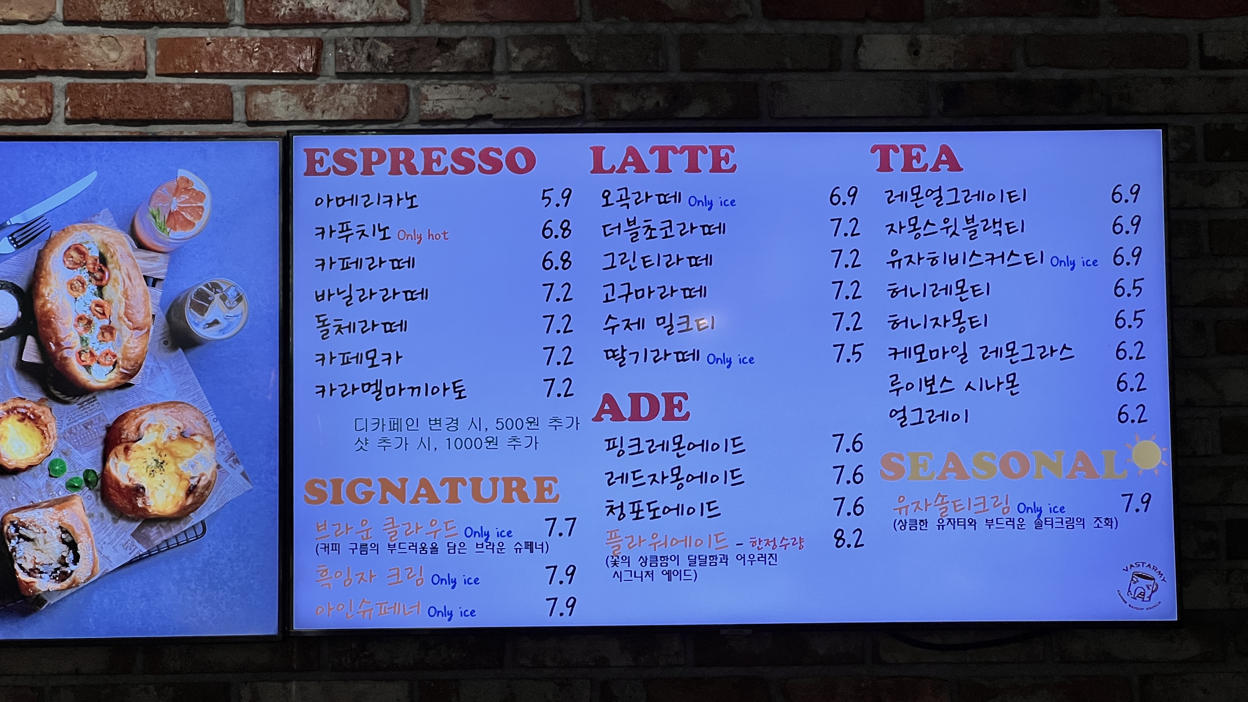 바스타미는 공간만 예쁜 게 아니라 베이커리 맛집으로도 퀄리티가 정말 훌륭합니다. 모든 빵을 매일 아침 매장에서 수제로 굽는다고 해요. 음료 메뉴는 아메리카노가 5.9천 원부터 시작하는 등 대형 카페치고는 합리적인 가격대였어요.