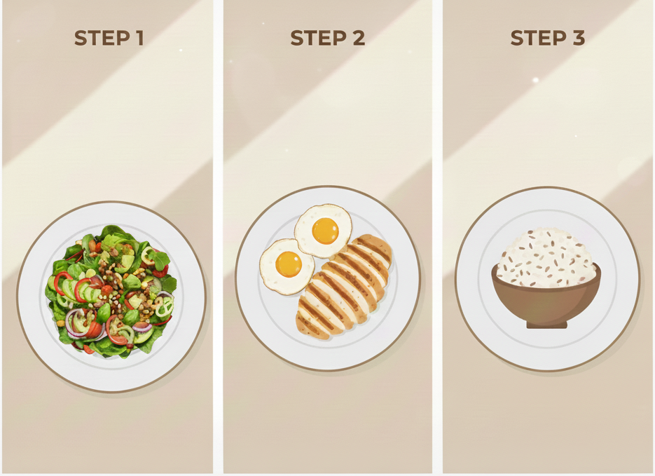 ✅ 식사법: 채소 → 단백질 → 탄수화물 순서로 천천히 먹기